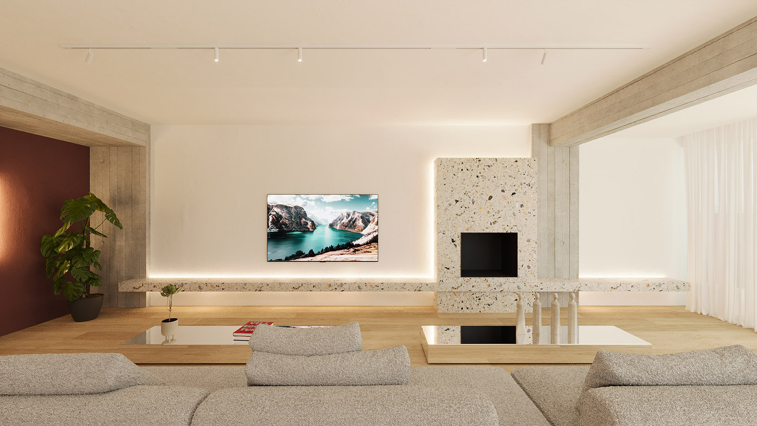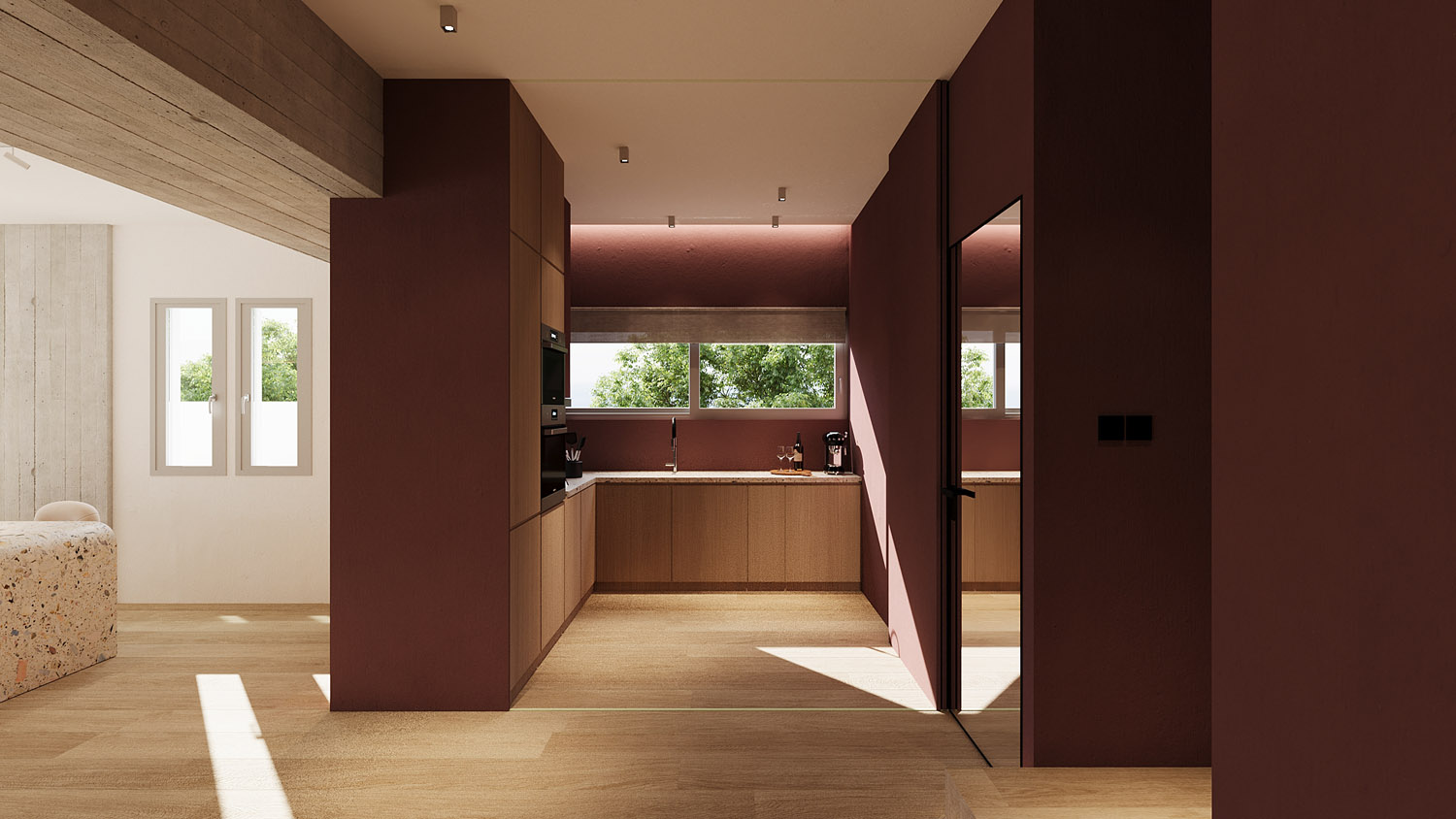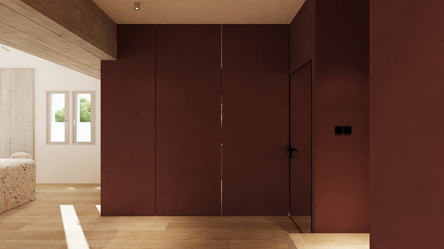 Στο εσωτερικό, μια σμιλευμένη ηρεμία γεμίζει τον χώρο εκεί όπου το terrazzo συναντά την υφή και η ήσυχη γεωμετρία πλαισιώνει τη σύνθεση. Το φως απλώνεται απαλά στις επιφάνειες, αποκαλύπτοντας τις απτές υφές του εμφανούς σκυροδέματος, του ξύλου και του υφάσματος. Ένας χώρος διαβίωσης αποσταγμένος στην ουσία του: γαλήνιος, γειωμένος και ανοιχτός στην παρουσία. Όχι μόνο για κατοίκηση, αλλά για παύση και συναίσθηση. Ένα συνεχές, ανοιχτό layout ενώνει το σαλόνι, την τραπεζαρία και την είσοδο, δημιουργώντας μια αρμονική ροή κίνησης αλλά και μια σύνθεση υφών, υλικοτήτων και φωτός.