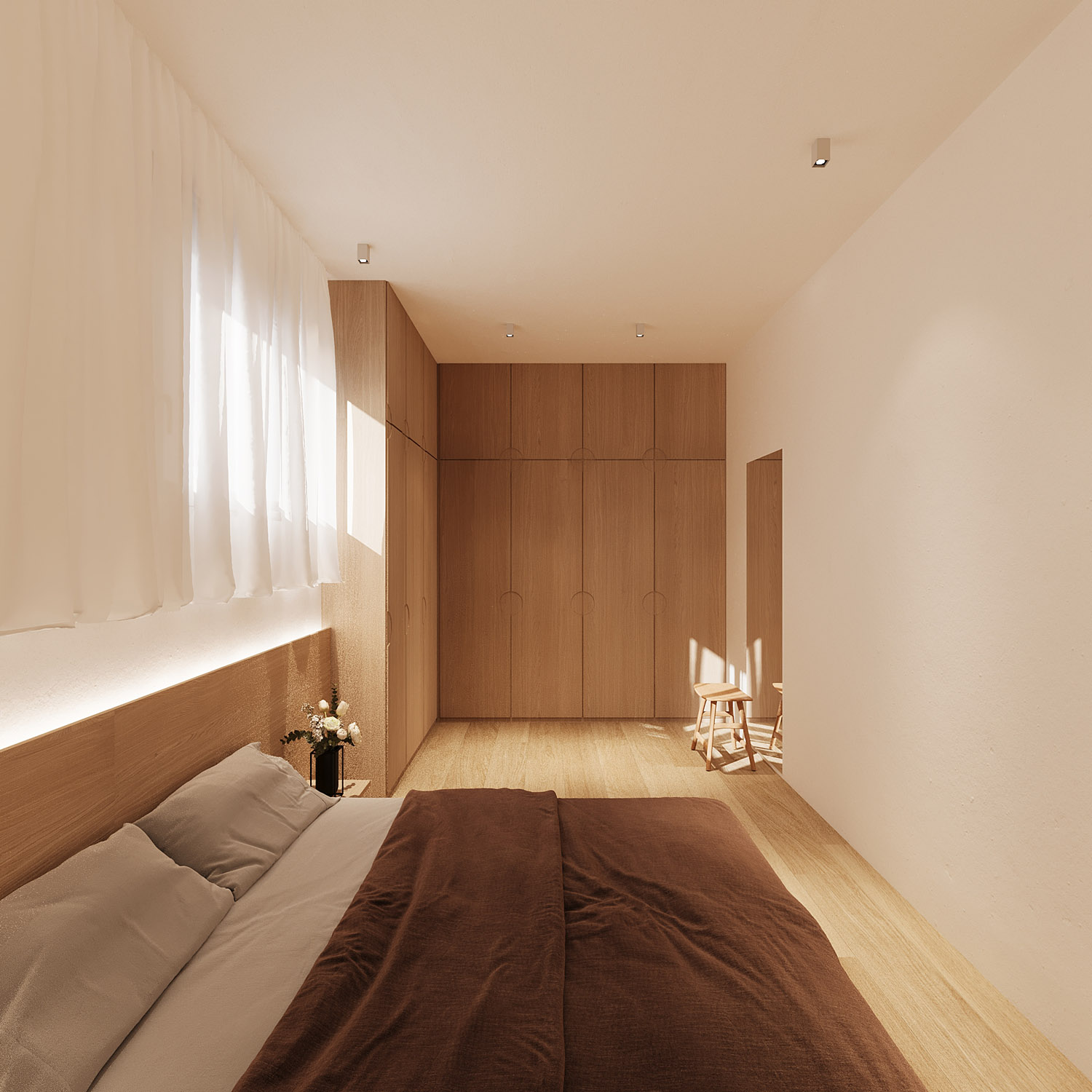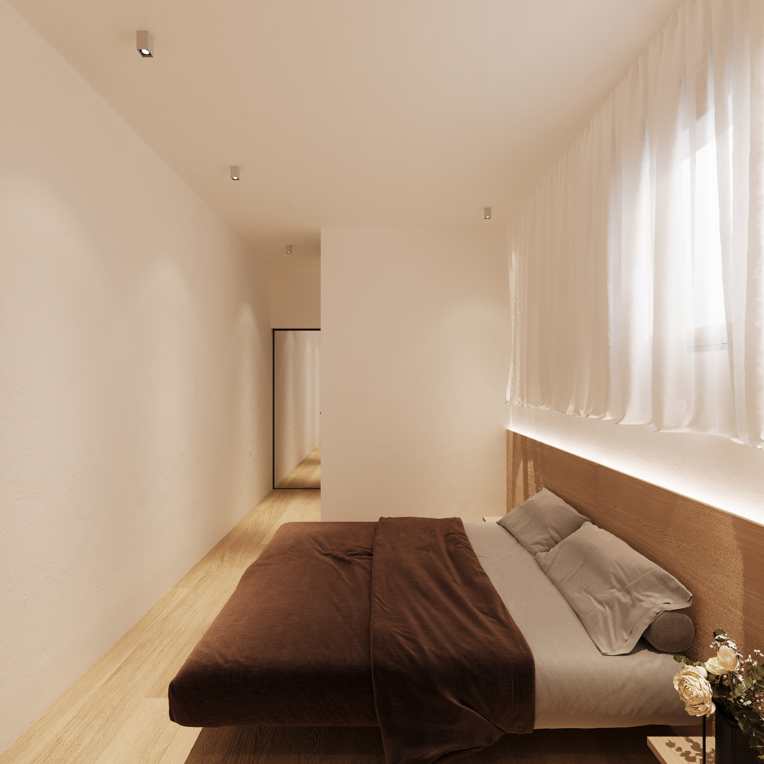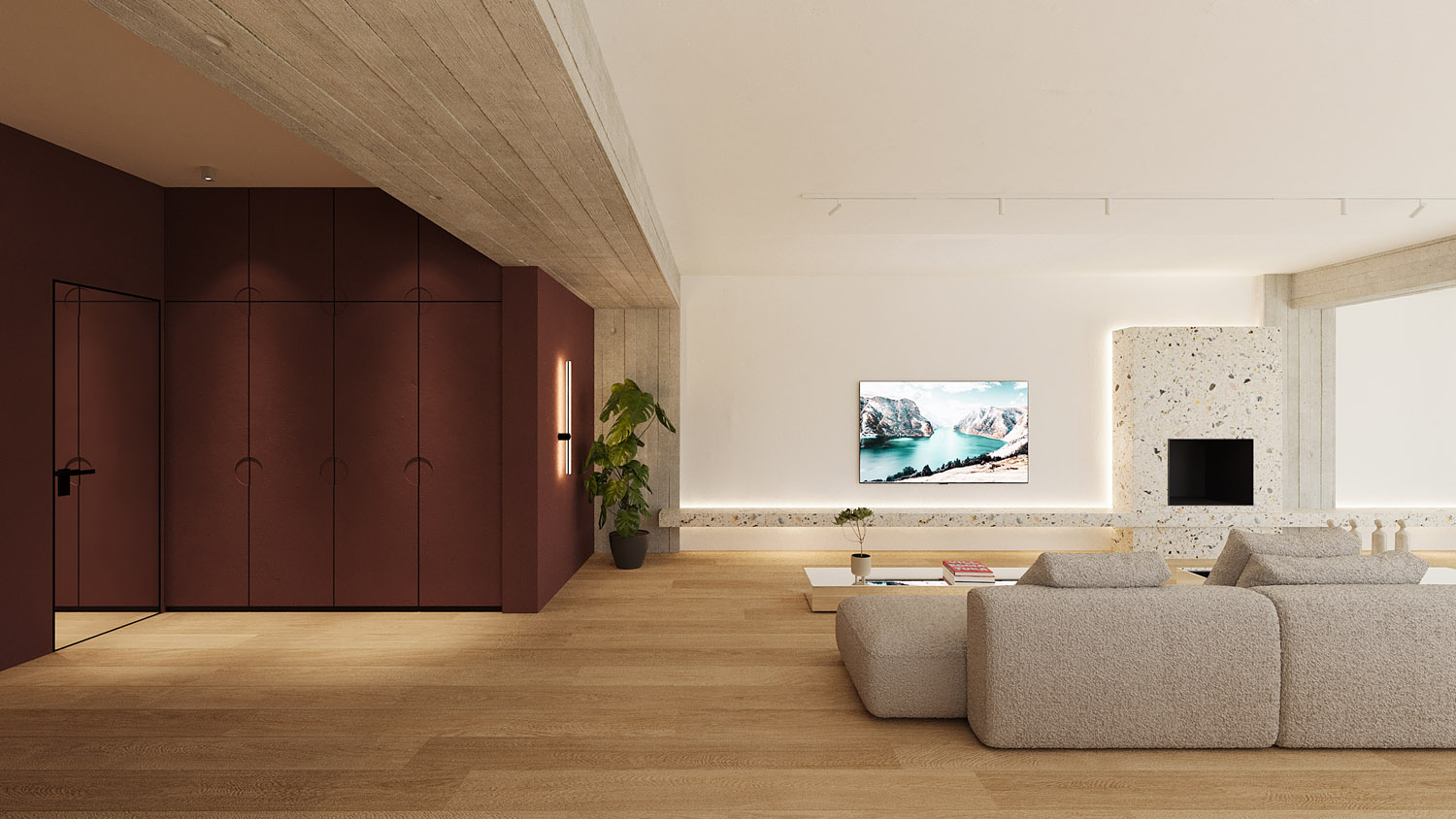 Στο εσωτερικό, μια σμιλευμένη ηρεμία γεμίζει τον χώρο εκεί όπου το terrazzo συναντά την υφή και η ήσυχη γεωμετρία πλαισιώνει τη σύνθεση. Το φως απλώνεται απαλά στις επιφάνειες, αποκαλύπτοντας τις απτές υφές του εμφανούς σκυροδέματος, του ξύλου και του υφάσματος. Ένας χώρος διαβίωσης αποσταγμένος στην ουσία του: γαλήνιος, γειωμένος και ανοιχτός στην παρουσία. Όχι μόνο για κατοίκηση, αλλά για παύση και συναίσθηση. Ένα συνεχές, ανοιχτό layout ενώνει το σαλόνι, την τραπεζαρία και την είσοδο, δημιουργώντας μια αρμονική ροή κίνησης αλλά και μια σύνθεση υφών, υλικοτήτων και φωτός.