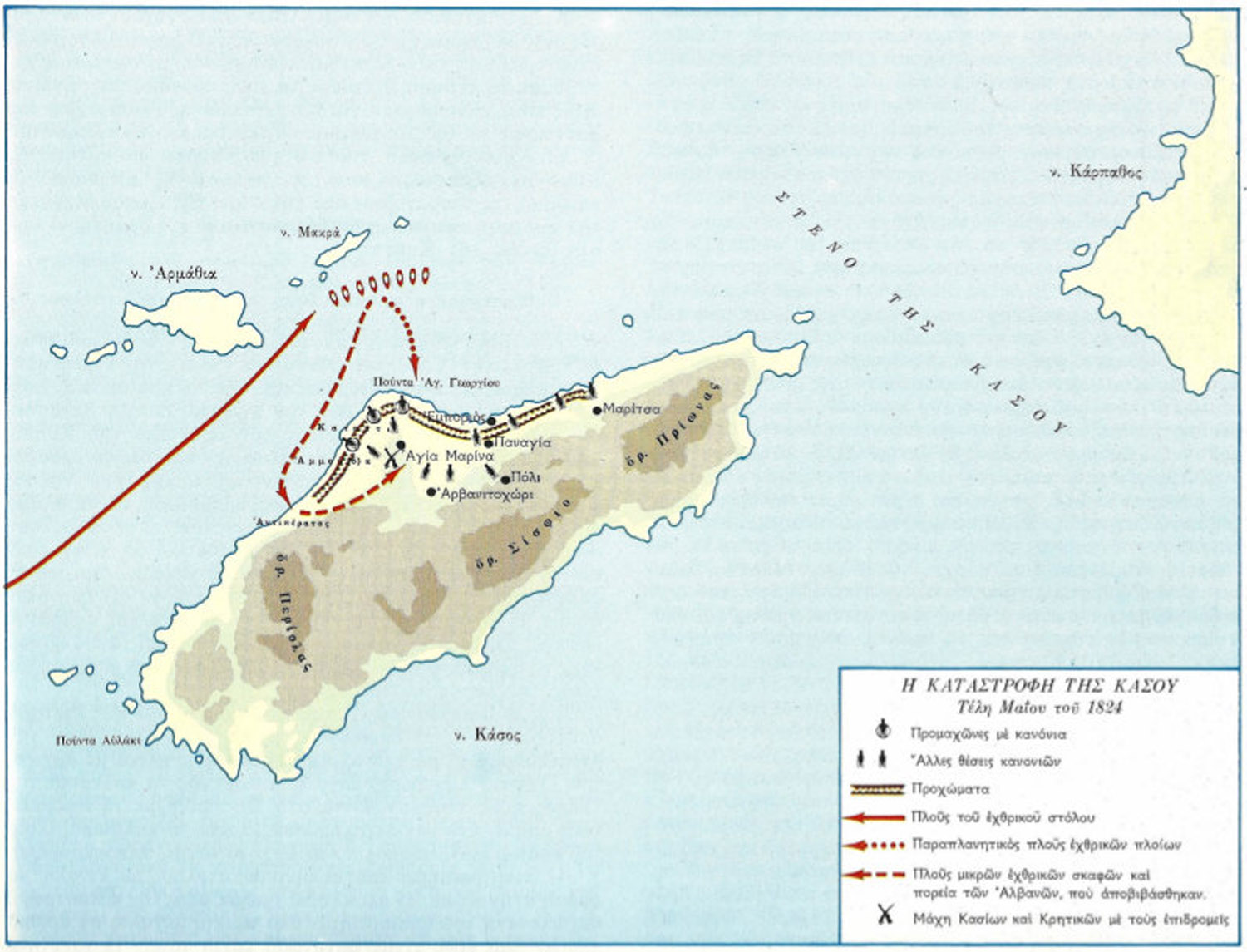 Το 1824, η Κάσος υπέστη μία από τις πλέον βίαιες καταστροφές της Ελληνικής Επανάστασης. Μετά από αλλεπάλληλες αποτυχημένες προσπάθειες των Τουρκοαιγυπτίων να εισβάλλουν στο νησί και να το κάψουν, ένας τοπικός προδότης έδωσε τελικά τη λύση, υποδεικνύοντάς τους την αφύλακτη παραλία της Αντιπεράτου. Τη νύχτα της εβδόμης Ιουνίου, οι άντρες των ναυάρχων Χουσεϊν και Γιβραλτάρ αποβιβάζονται στην Αντιπέρατο, κι απο εκεί, εισβάλλουν στο υπόλοιπο νησί, αιφνιδιάζοντας τους κατοίκους. Ακολουθούν σφαγές και ανείπωτη θηριωδία. Χιλιάδες άντρες νεκροί, εκατοντάδες γυναίκες και παιδιά στα σκλαβοπάζαρα της Αφρικής.