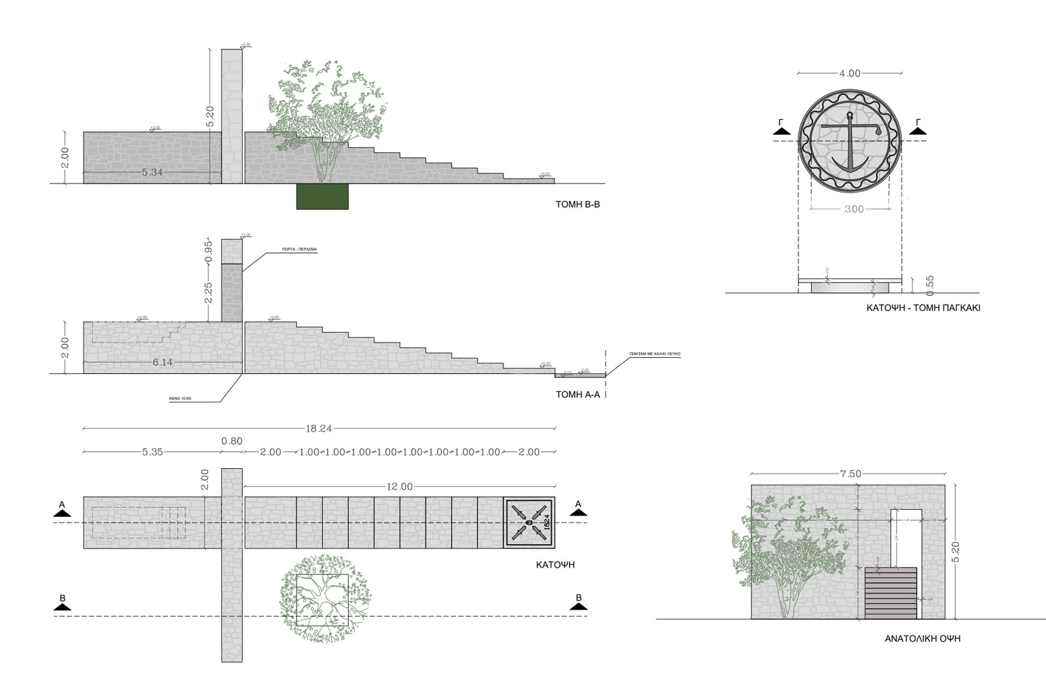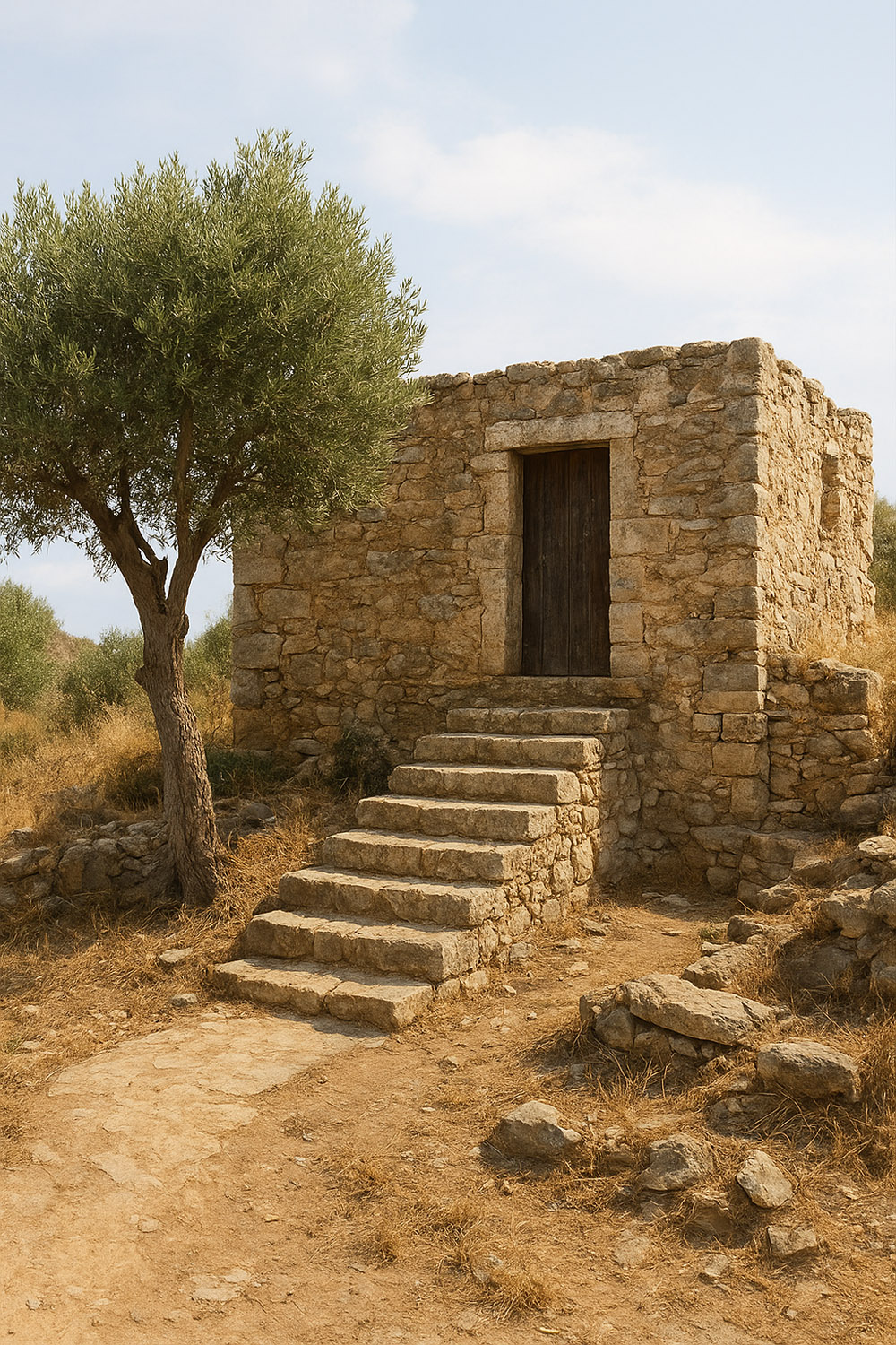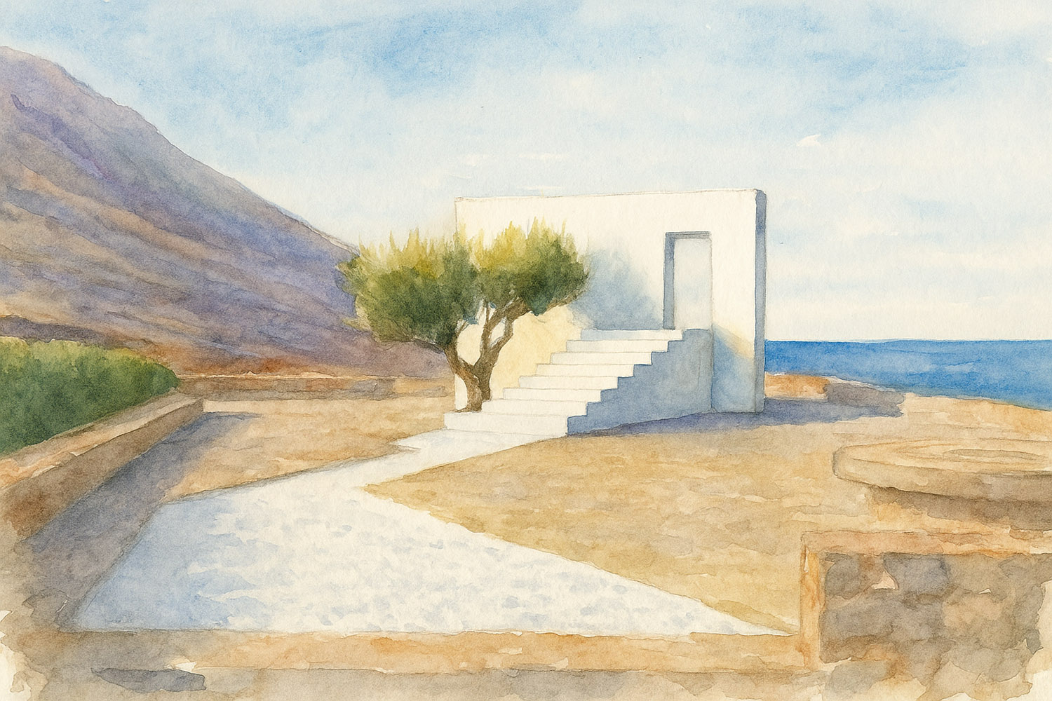 γ) Αμέσως μετά, ορθώνεται μπροστά του ο πέτρινος τοίχος. Λιτός, ασβεστωμένος, ένα αρχιτεκτονικό στοιχείο της κασιώτικης αλλά και της ευρύτερης νησιώτικης αρχιτεκτονικής.